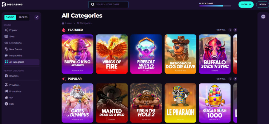 O Discasino é uma plataforma que foca na simplicidade e eficiência. Com uma seleção variada de slots e jogos de mesa, oferece bónus regulares e suporte a criptomoedas.